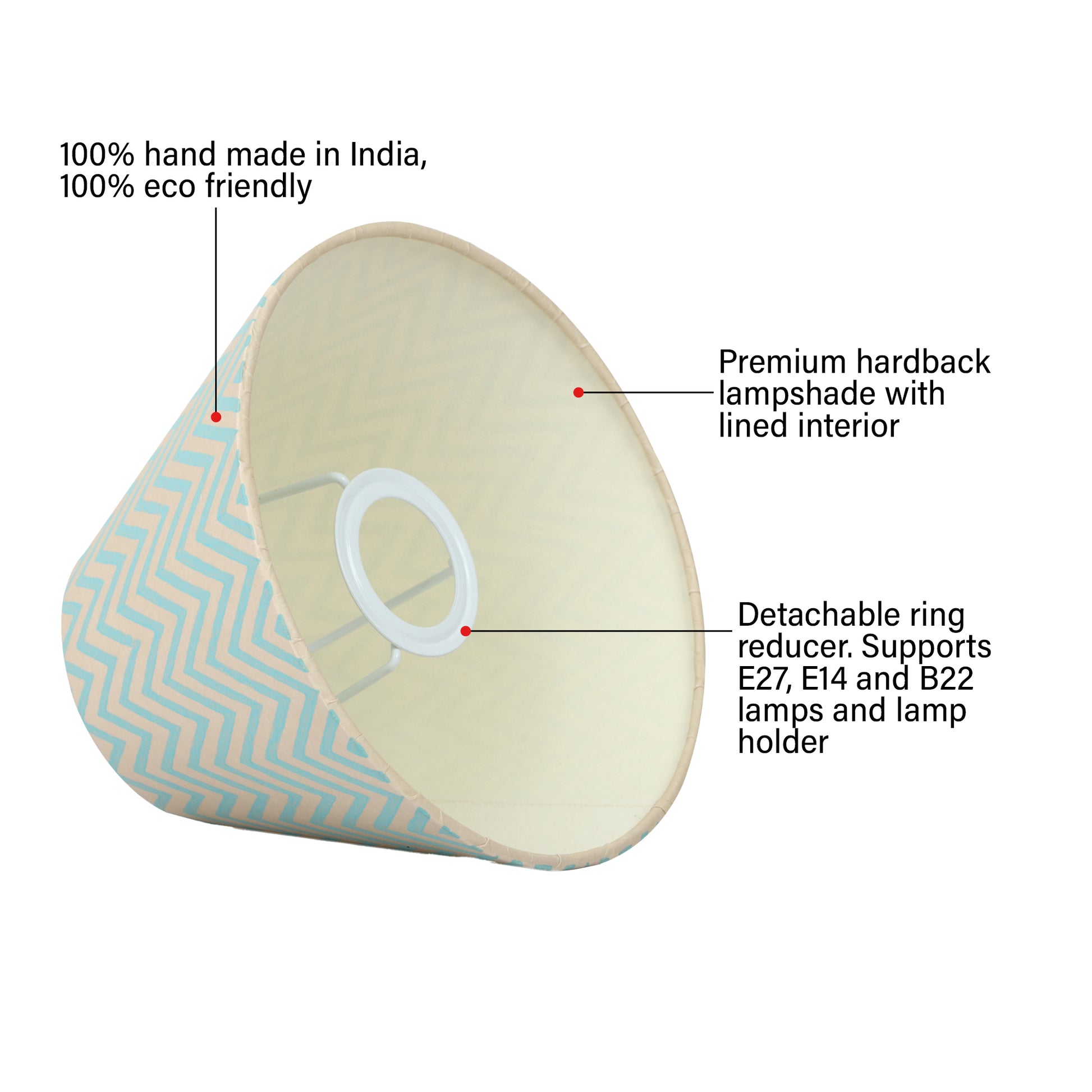 A hardback premium printed paper shade handmade by incredibly skilled craftswoman. This is a 20cm size (bottom diameter) lampshade which is designed to work with a British (B22) or European (E27/E14) bulb holder. We also provide a reducer ring that allows shades to sit comfortably on a B22 holder. If it is E27/E14, simply push out the reducer. This lampshade can be used on top of table lamps or floor lamps. Our shades are completely handmade and yet of top quality, eco-friendly, and of course 100% made in India. Dimensions (cms) : Top - 10, Bottom- 20, Height - 13
