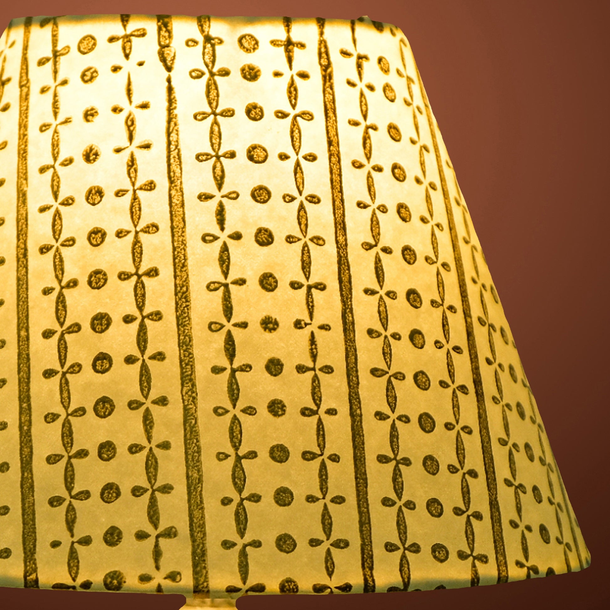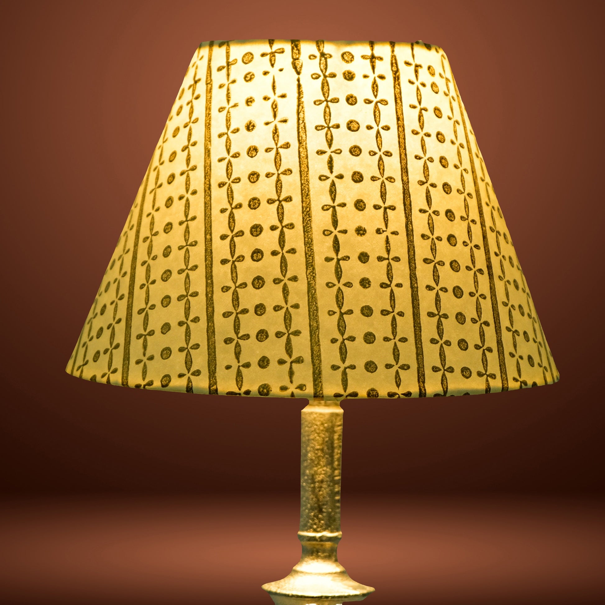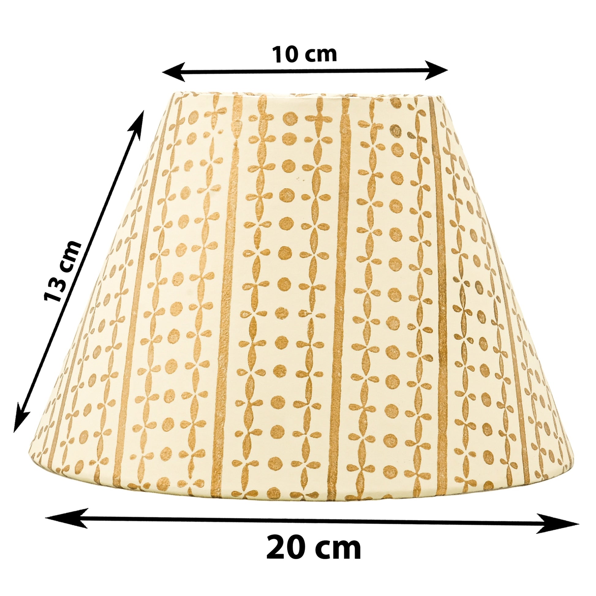 A hardback premium block printed paper shade handmade by incredibly skilled craftswoman. This is a 20cm size (bottom diameter) lampshade which is designed to work with a British (B22) or European (E27/E14) bulb holder. We also provide a reducer ring that allows shades to sit comfortably on a B22 holder. If it is E27/E14, simply push out the reducer. This lampshade can be used on top of table lamps or floor lamps. Our shades are completely handmade and yet of top quality, eco-friendly, and of course 100% made in India. Dimensions (cms) : Top - 10, Bottom- 20, Height - 13