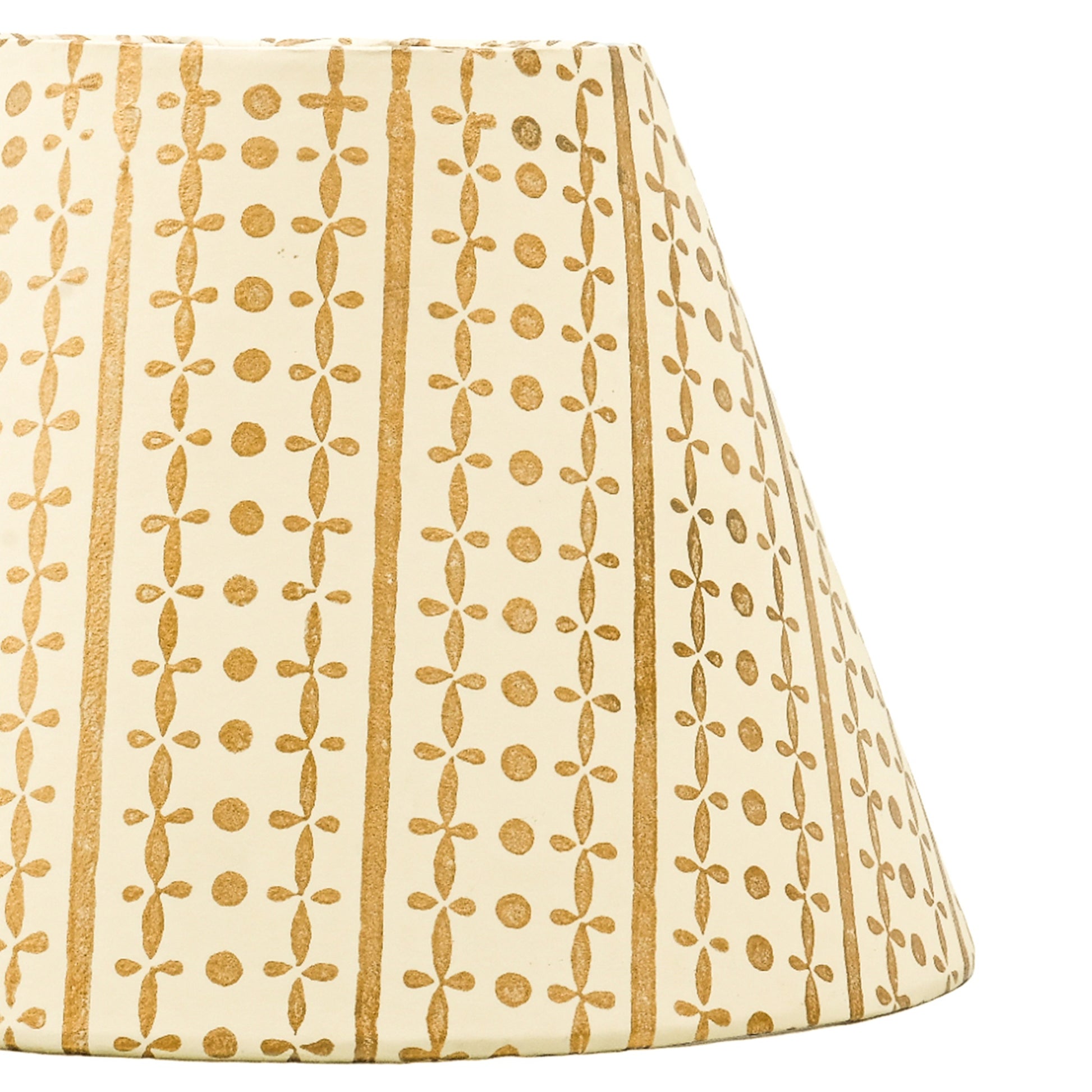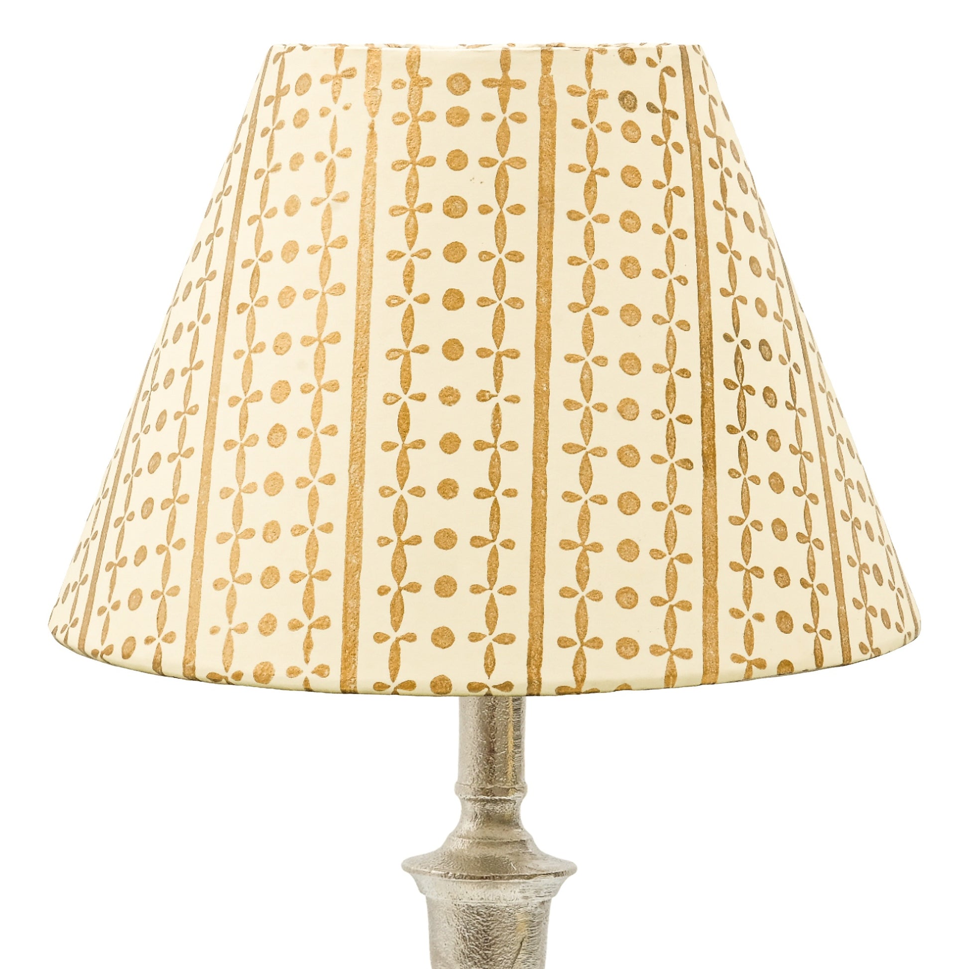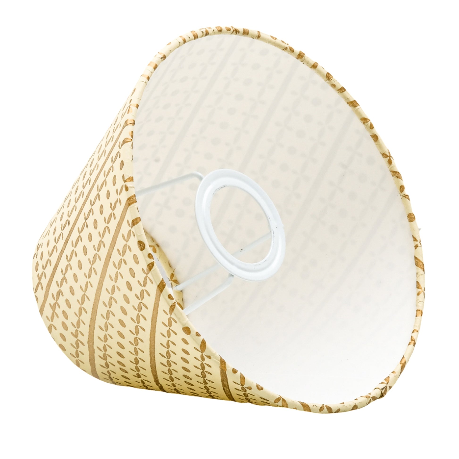 A hardback premium block printed paper shade handmade by incredibly skilled craftswoman. This is a 20cm size (bottom diameter) lampshade which is designed to work with a British (B22) or European (E27/E14) bulb holder. We also provide a reducer ring that allows shades to sit comfortably on a B22 holder. If it is E27/E14, simply push out the reducer. This lampshade can be used on top of table lamps or floor lamps. Our shades are completely handmade and yet of top quality, eco-friendly, and of course 100% made in India. Dimensions (cms) : Top - 10, Bottom- 20, Height - 13