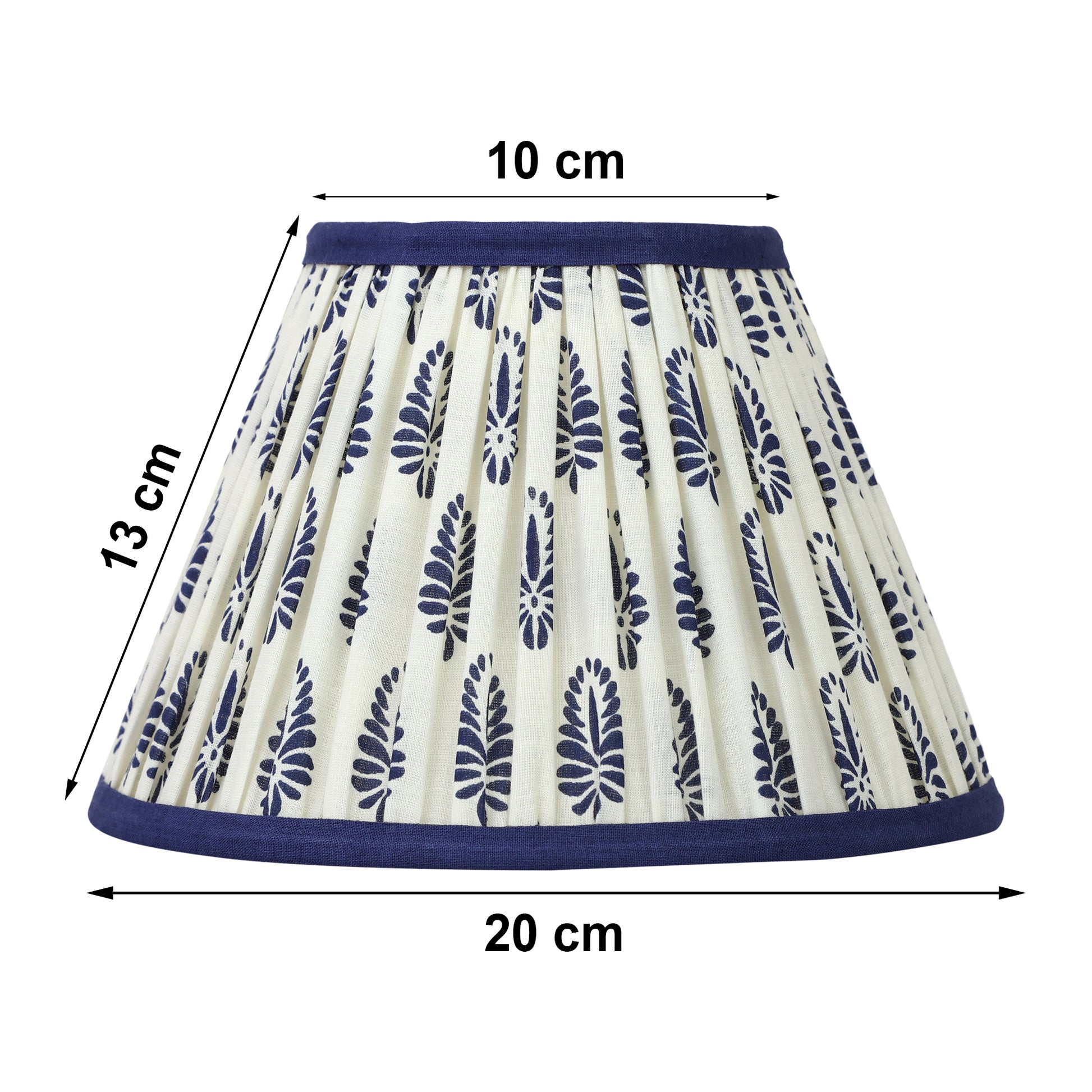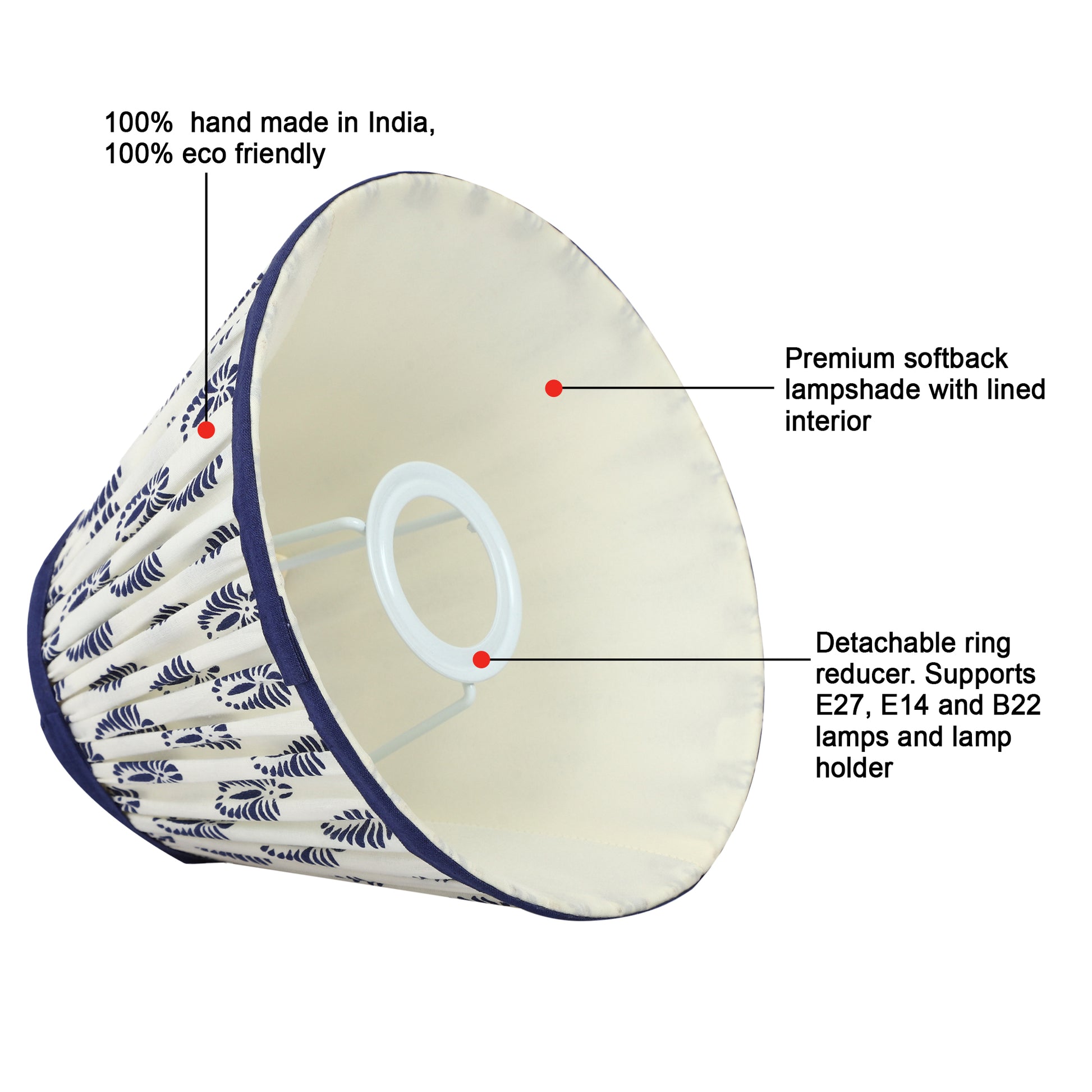 A softback printed cotton shade handmade by incredibly skilled craftswoman. This is a 20cm size (bottom diameter) lampshade which is designed to work with a British (B22) or European (E27/E14) bulb holder. We also provide a reducer ring that allows shades to sit comfortably on a B22 holder. If it is E27/E14, simply push out the reducer. This lampshade can be used on top of table lamps or floor lamps. Our shades are completely handmade and yet of top quality, eco-friendly, and of course 100% made in India. Dimensions (cms) : Top - 10, Bottom- 20, Height - 13