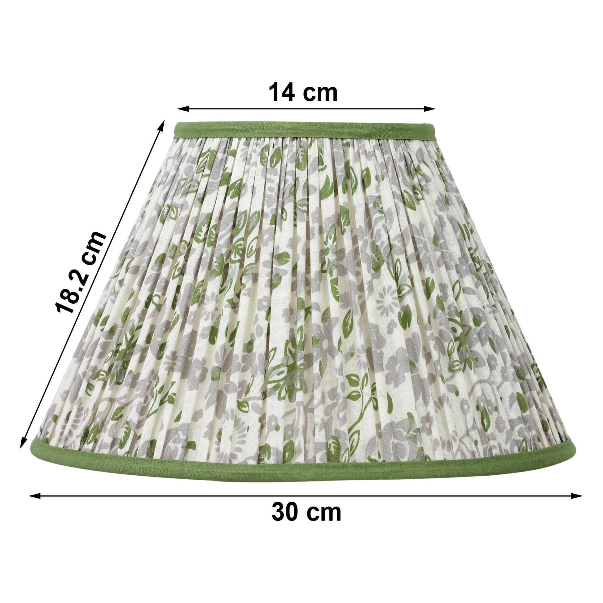 A softback printed cotton shade handmade by incredibly skilled craftswoman. This is a 30cm size (bottom diameter) lampshade which is designed to work with a British (B22) or European (E27/E14) bulb holder. We also provide a reducer ring that allows shades to sit comfortably on a B22 holder. If it is E27/E14, simply push out the reducer. This lampshade can be used as pendant/hanging or on top of table lamps/floor lamps. Our shades are completely handmade and yet of top quality, eco-friendly, and of course 100% made in India. Dimensions (cms) : Top - 14, Bottom- 30, Height - 18.2