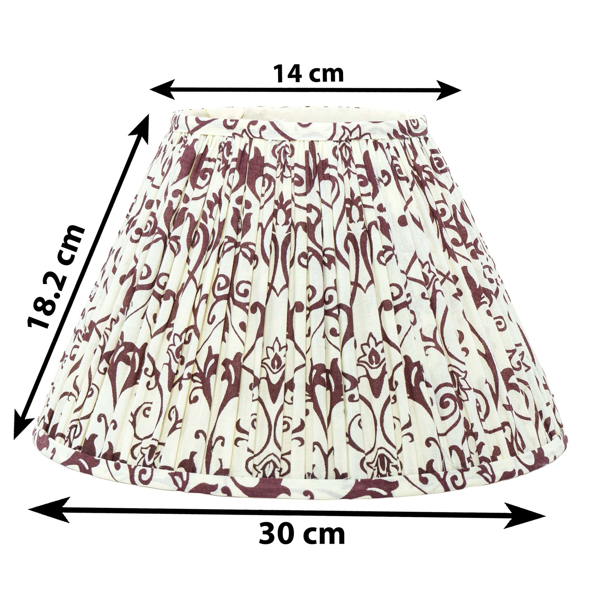 A softback printed cotton shade handmade by incredibly skilled craftswoman. This is a 30cm size (bottom diameter) lampshade which is designed to work with a British (B22) or European (E27/E14) bulb holder. We also provide a reducer ring that allows shades to sit comfortably on a B22 holder. If it is E27/E14, simply push out the reducer. This lampshade can be used as pendant/hanging or on top of table lamps/floor lamps. Our shades are completely handmade and yet of top quality, eco-friendly, and of course 100% made in India. Dimensions (cms) : Top - 14, Bottom- 30, Height - 18.2