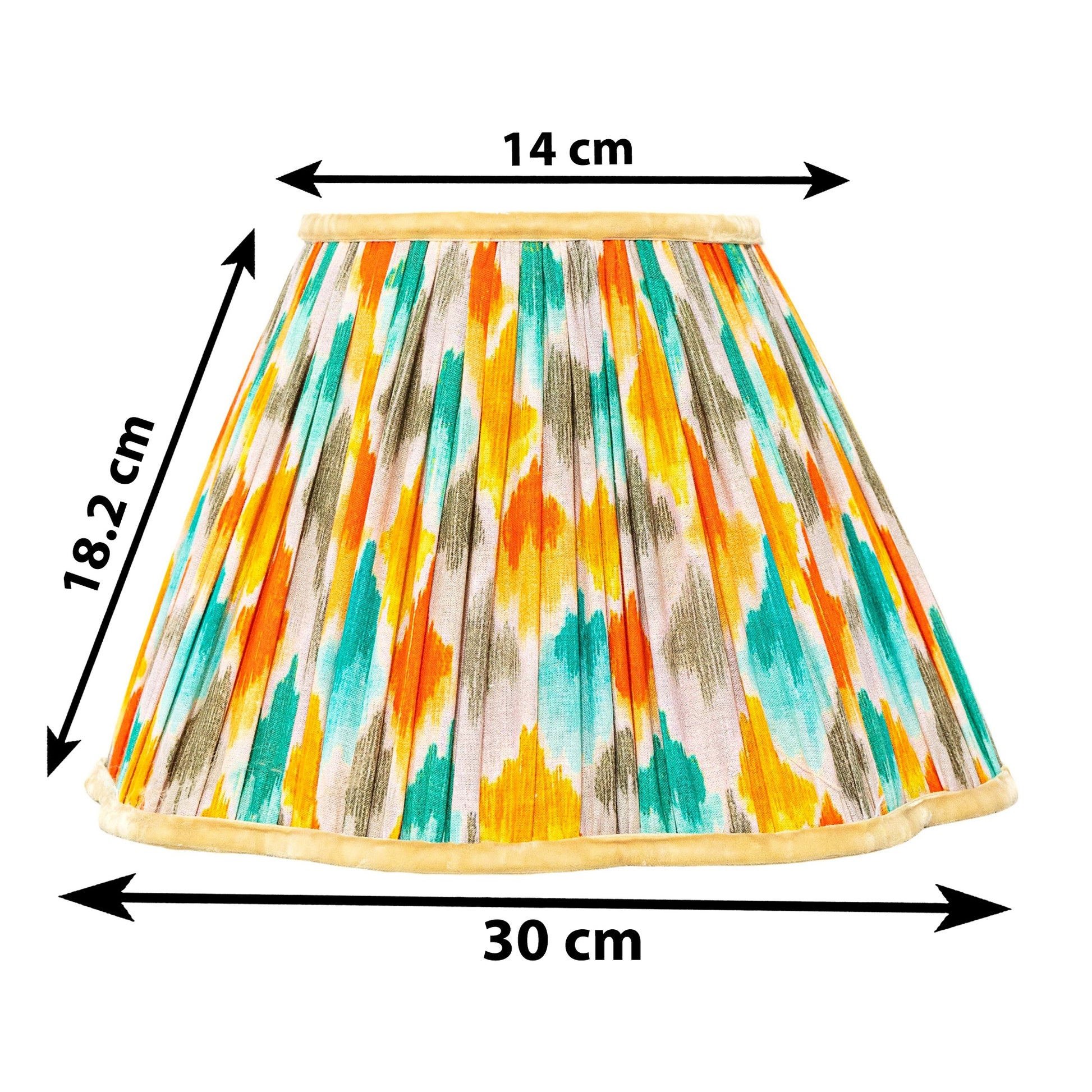 A softback printed cotton shade handmade by incredibly skilled craftswoman. This is a 30cm size (bottom diameter) lampshade which is designed to work with a British (B22) or European (E27/E14) bulb holder. We also provide a reducer ring that allows shades to sit comfortably on a B22 holder. If it is E27/E14, simply push out the reducer. This lampshade can be used as pendant/hanging or on top of table lamps/floor lamps. Our shades are completely handmade and yet of top quality, eco-friendly, and of course 100% made in India. Dimensions (cms) : Top - 14, Bottom- 30, Height - 18.2