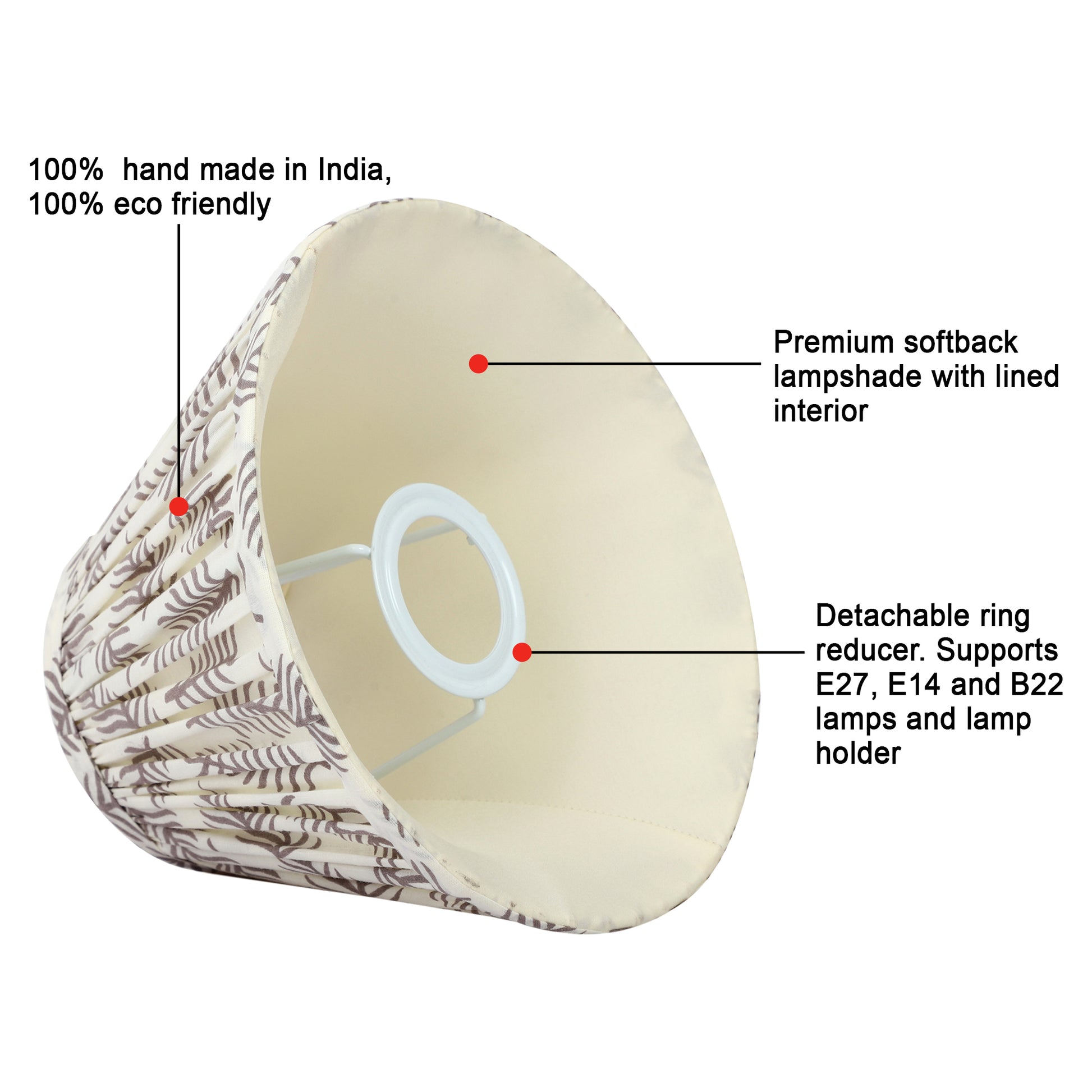 A softback printed cotton shade handmade by incredibly skilled craftswoman. This is a 30cm size (bottom diameter) lampshade which is designed to work with a British (B22) or European (E27/E14) bulb holder. We also provide a reducer ring that allows shades to sit comfortably on a B22 holder. If it is E27/E14, simply push out the reducer. This lampshade can be used as pendant/hanging or on top of table lamps/floor lamps. Our shades are completely handmade and yet of top quality, eco-friendly, and of course 100% made in India. Dimensions (cms) : Top - 14, Bottom- 30, Height - 18.2