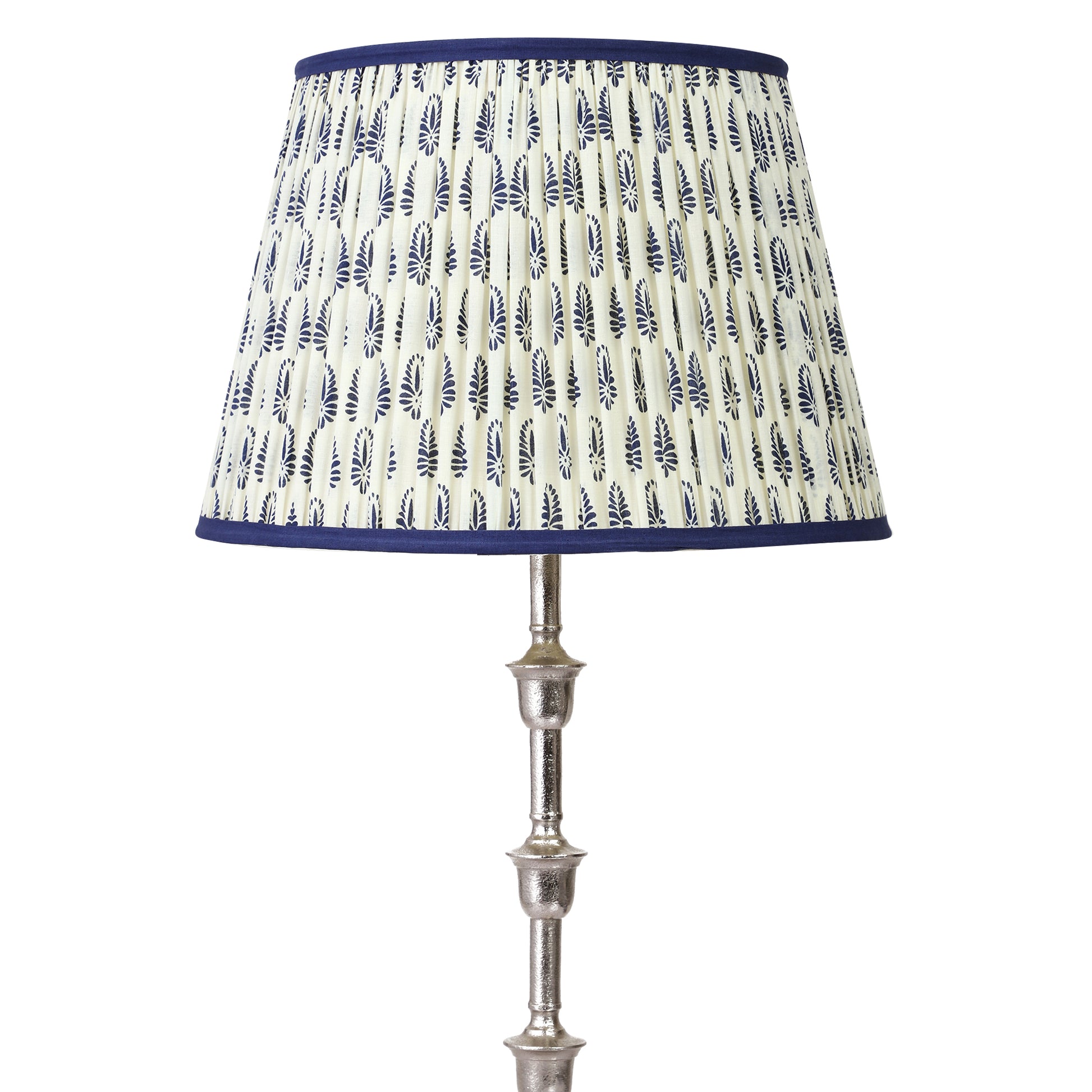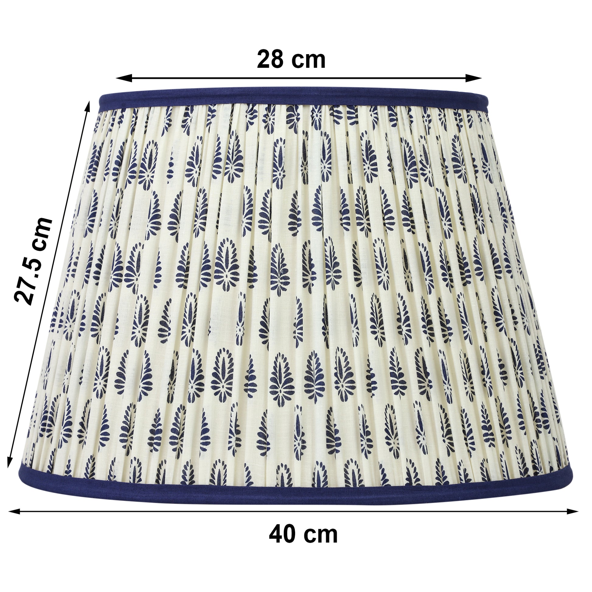 A softback printed cotton shade handmade by incredibly skilled craftswoman. This is a 40cm size (bottom diameter) lampshade which is designed to work with a British (B22) or European (E27/E14) bulb holder. We also provide a reducer ring that allows shades to sit comfortably on a B22 holder. If it is E27/E14, simply push out the reducer. This lampshade can be used as pendant/hanging or on top of table lamps/floor lamps. Our shades are completely handmade and yet of top quality, eco-friendly, and of course 100% made in India. Dimensions (cms) : Top - 28, Bottom- 40, Height - 27.5
